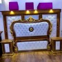 Sa structure en bois massif finement sculpté s’allie à un garnissage capitonné blanc en simili cuir, agrémenté de détails dorés raffinés.